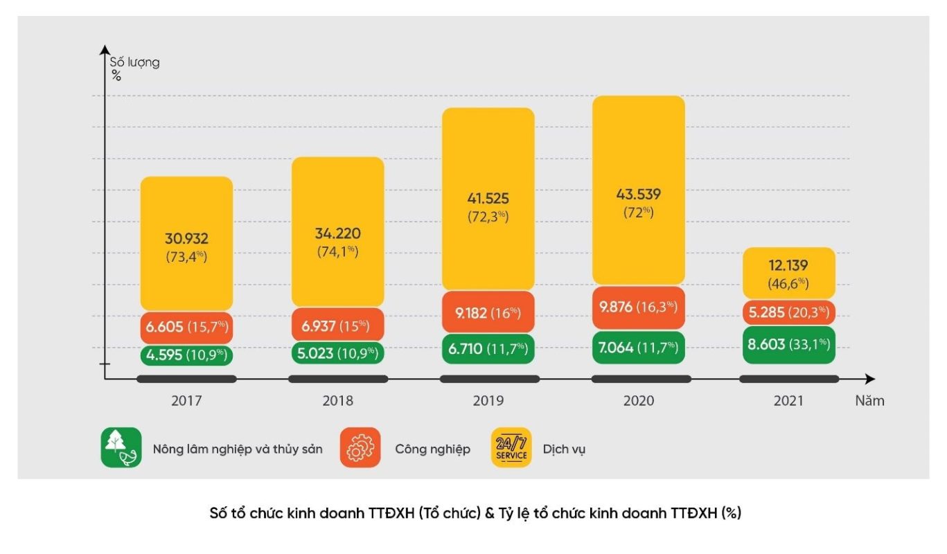 Tỷ trọng các tổ chức hoạt động trong lĩnh vực nông nghiệp tuy chiếm khoảng 10-11% tổng số SIEs trong giai đoạn 2017-2020, nhưng đến năm 2021 đã tăng vọt lên 33,1%, phản ánh sự dịch chuyển mạnh mẽ trong ưu tiên phát triển và vai trò ngày càng quan trọng của nông nghiệp bền vững trong nền kinh tế.
