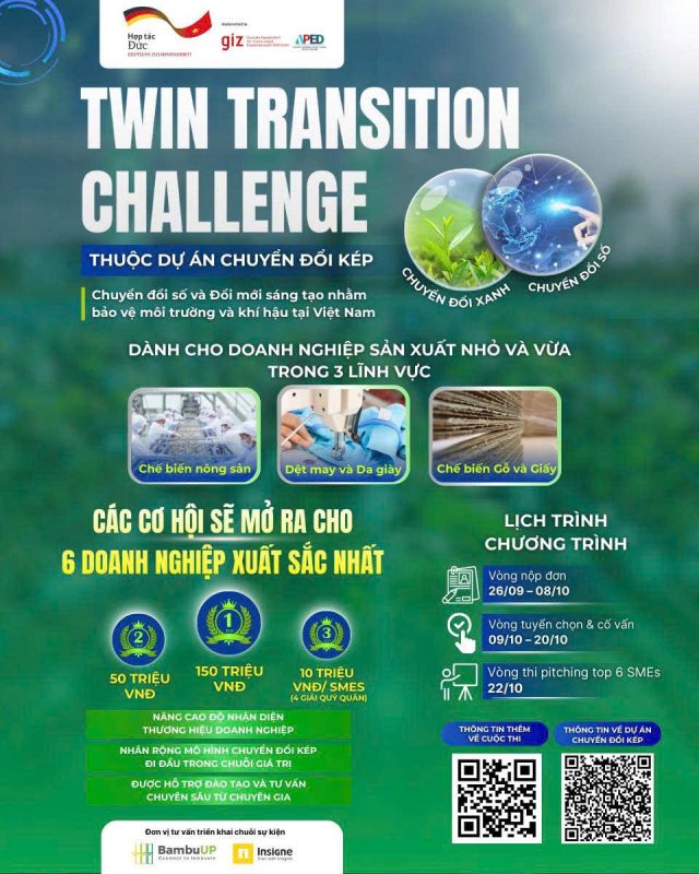 Chương trình Twin Transition Challenge hướng tới việc tìm kiếm và tôn vinh các doanh nghiệp sản xuất nhỏ và vừa (SMEs) Việt Nam đã và đang áp dụng mô hình chuyển đổi kép (số và xanh) trong 3 lĩnh vực: Chế biến nông sản, Chế biến giấy và gỗ, Dệt may và Da giày, nhằm tối ưu hóa sử dụng năng lượng và tài nguyên, hướng đến việc giảm phát thải, và phát triển bền vững.
